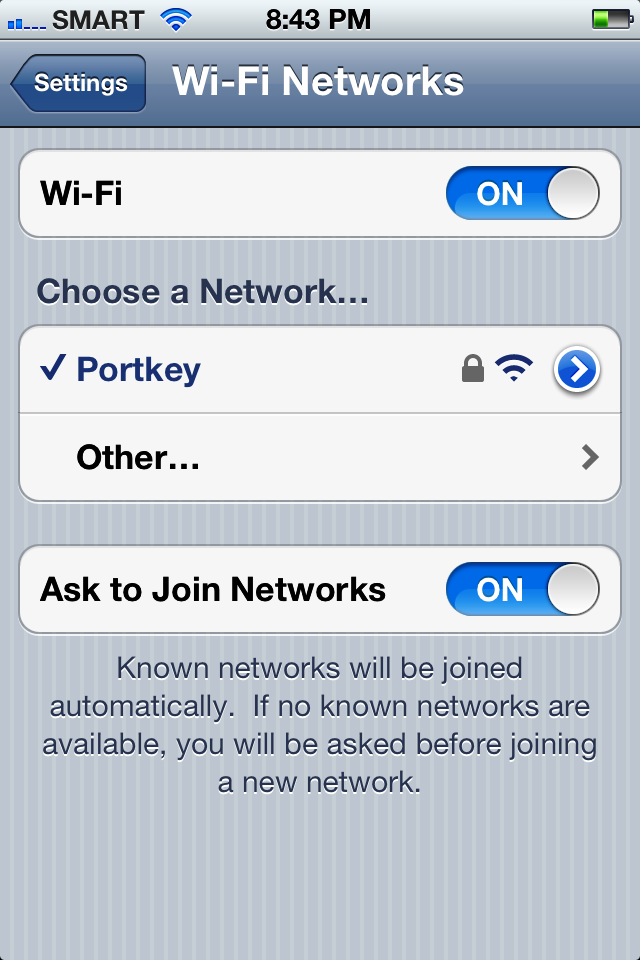 | A successful Wi-Fi connection established in iPhone 4S is confirmed by a tick mark beside the wireless network name. |